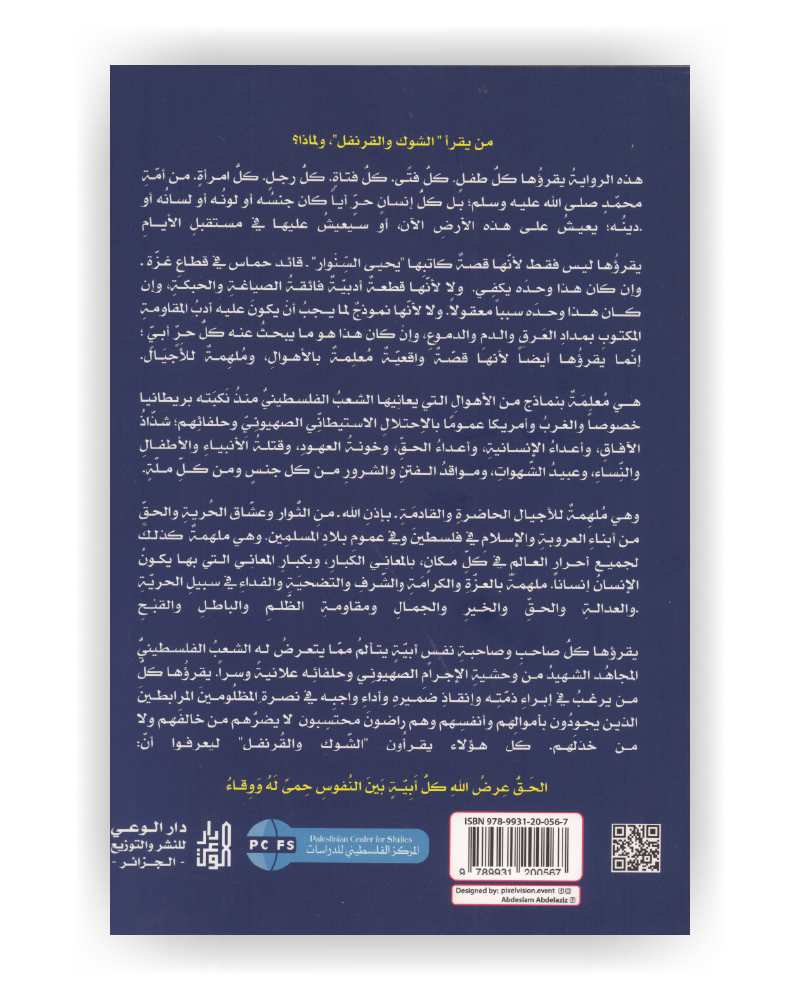 | وصف قصير: | رواية «الشوك والقرنفل» لـ يحيى السنوار هي عمل أدبي يعكس تجربة النضال الفلسطيني من الداخل، حيث تمزج بين الألم والأمل في حياة الشعب الفلسطيني تحت الاحتلال. تدور أحداثها حول شاب يعيش تحولات قاسية بين المعاناة اليومية والمقاومة، في عالم تتجاور فيه “الشوك” كرمز للمعاناة و“القرنفل” كرمز للحب والأمل. تقدم الرواية صورة إنسانية عميقة عن الصراع، وتبرز التضحيات، والانتماء، والتشبث بالحياة رغم الظروف الصعبة. |